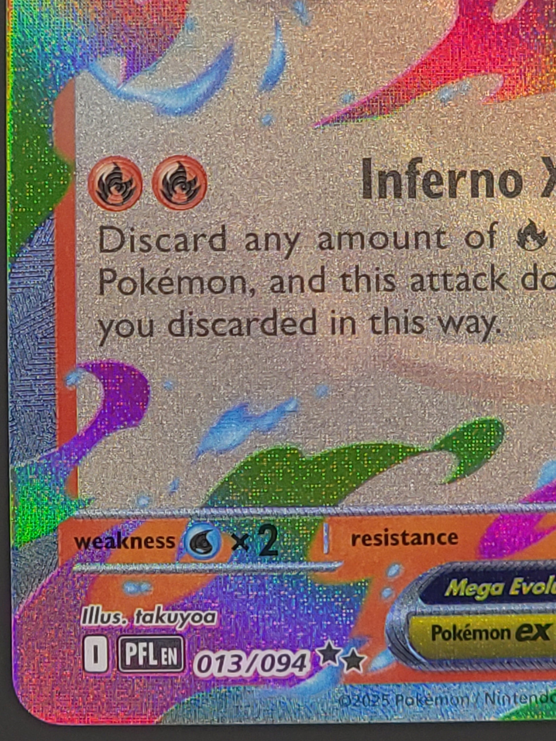 Mega Charizard X ex 013/094 from the Phantasmal Flames expansion (Mega Evolution series) showcases the iconic Mega form with bold EX power and brilliant holo. A centerpiece pull for Charizard fans and a standout of the Mega Evolution era.